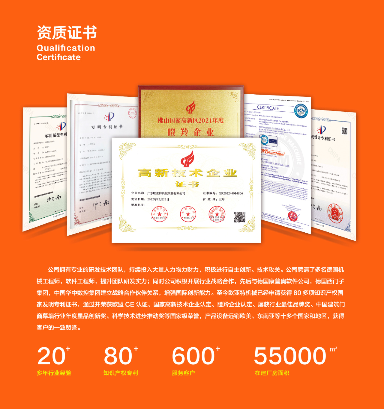 公司注重研發(fā)與科技創(chuàng)新,先后獲得國家高新技術(shù)企業(yè)、瞪羚企業(yè)、科技型中小企業(yè)以及規(guī)模以上工業(yè)企業(yè)等榮譽(yù)稱號(hào)。目前,我們?cè)诮ㄖb飾幕墻加工設(shè)備領(lǐng)域,處于行業(yè)領(lǐng)先地位,產(chǎn)品遠(yuǎn)銷海內(nèi)外。